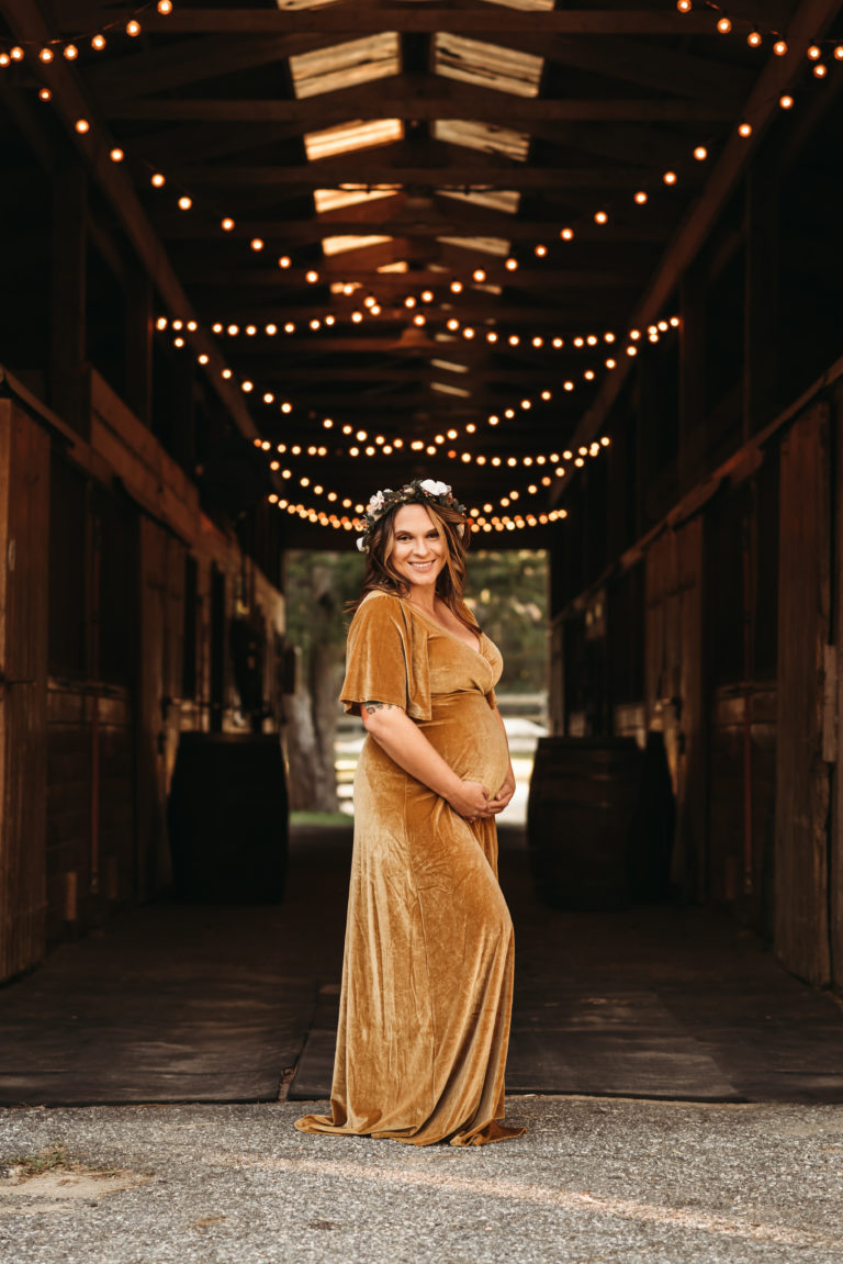 When it came time for Jackie’s maternity session she wanted more of a rustic feel for her photo shoot. We chose Meadow Creek Farm just outside of Avalon, NJ in Cape May Court House, NJ. This location is actually a really cool outdoor event venue mainly for weddings. It offers so much in just one space. Jackie showed up with her hair done by Sarah from Tint Color Bar paired with a flower crown from my client closet. Jackie is also a talented makeup artist so her makeup was perfection. Jackie chose two gowns for her maternity photo shoot. We started out with a beautiful gold wrap dress from Baltic Born, which I loved so much that I added it to my client closet! We began at the barn and I always love to mix in family, couple as well as individual photos during my maternity sessions.